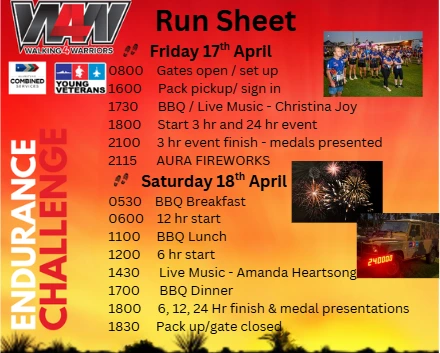Friday 17th April 2026 1800 start for the 3 and 24 hour participants (note for 24hr registrations the timeslot will show only 3 hrs but please ignore that part of the booking calendar)